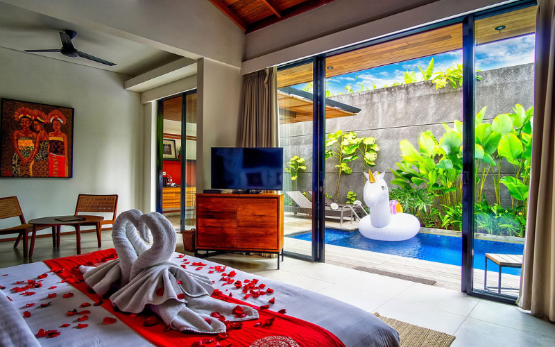 What could be more romantic than floating on an inflatable unicorn in a private pool... With rose petals scattered over the bed... And located close to the famous sunset beach, it's the perfect destination for honeymoon couples to celebrate their love in style at Abia Villas.
